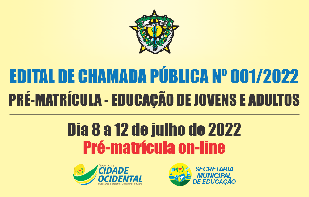 EDITAL DE CHAMADA PÚBLICA DA SECRETARIA MUNICIPAL DE EDUCAÇÃO - PRÉ MATRÍCULA VISANDO O PREENCHIMENTO DE VAGAS NAS UNIDADES DE ENSINO DA REDE PÚBLICA MUNICIPAL DE ENSINO, COMO FORMA DE ATENDER A DEMANDA DA EDUCAÇÃO DE JOVENS E ADULTOS - ENSINO FUNDAMENTAL.