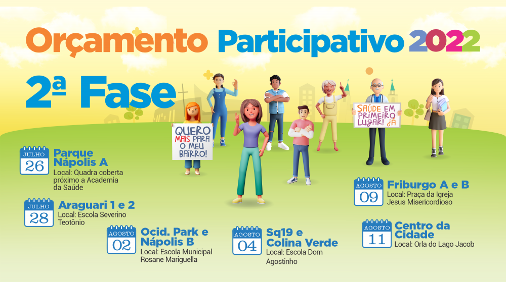 A segunda fase do Orçamento Participativo terá início no dia 26 de julho no Parque Nápolis A e vai até o dia 11 de agosto com o último encontro na Orla do Lago Jacob. Não deixe de participar. Convide o vizinho, amigo e parente e venha fazer parte do crescimento do seu bairro. Os encontros acontecem às 19h, sempre as terças e quintas feiras. Confira a programação completa nas redes sociais e site da prefeitura.