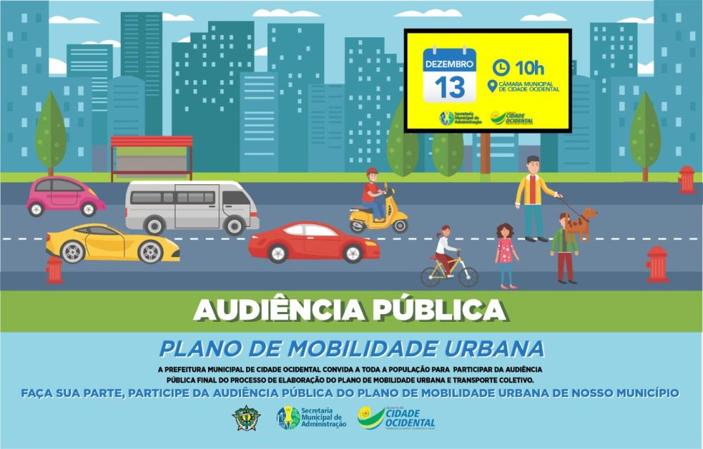 A Prefeitura Municipal de Cidade Ocidental, através da Secretaria Municipal de Administração convida a todos para participar da Audiência Pública final do processo de elaboração do Plano de Mobilidade Urbana e Transporte Coletivo, que será no dia 13 de dezembro às 10h na Câmara Municipal de Cidade Ocidental.