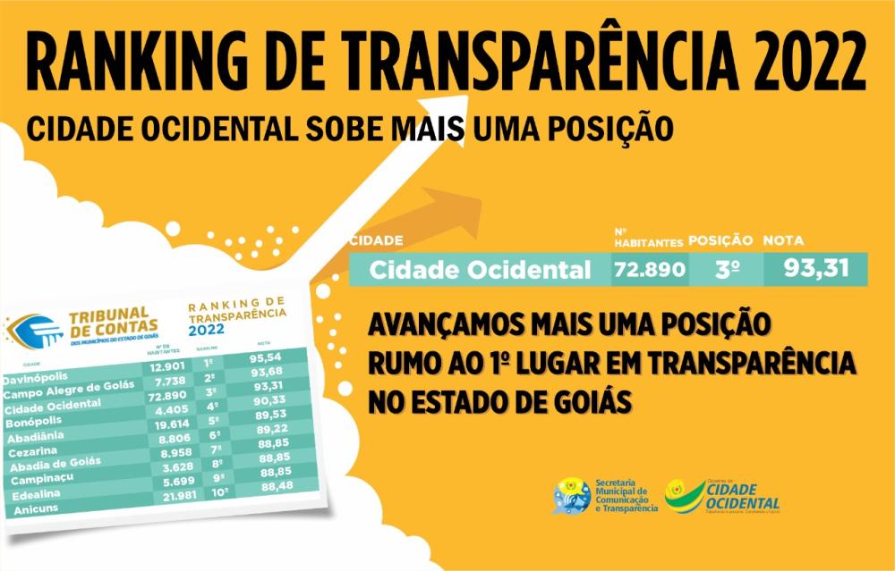 Mais uma vez Cidade Ocidental se destaca pelas suas boas práticas no quesito transparência. Comparado com o relatório de 2021, o município subiu uma posição e agora ocupa o terceiro lugar no ranking do Tribunal de Contas dos Municípios do Estado de Goiás (TCM) que classifica os 246 entes goianos mais bem avaliados quando se refere ao cumprimento da Lei de Acesso à Informação. Com índice de 93.31 dos 100 pontos possíveis, Cidade Ocidental só perde para Davinópolis (1º colocado, com 95,54 pontos) e Campo Alegre (2º, com 93.68 pontos). Vale destacar que para este ano o TCM mudou os parâmetros de avaliação com a inclusão de novas metodologias para processar os dados. Ainda assim Cidade Ocidental segue entre os mais transparentes.