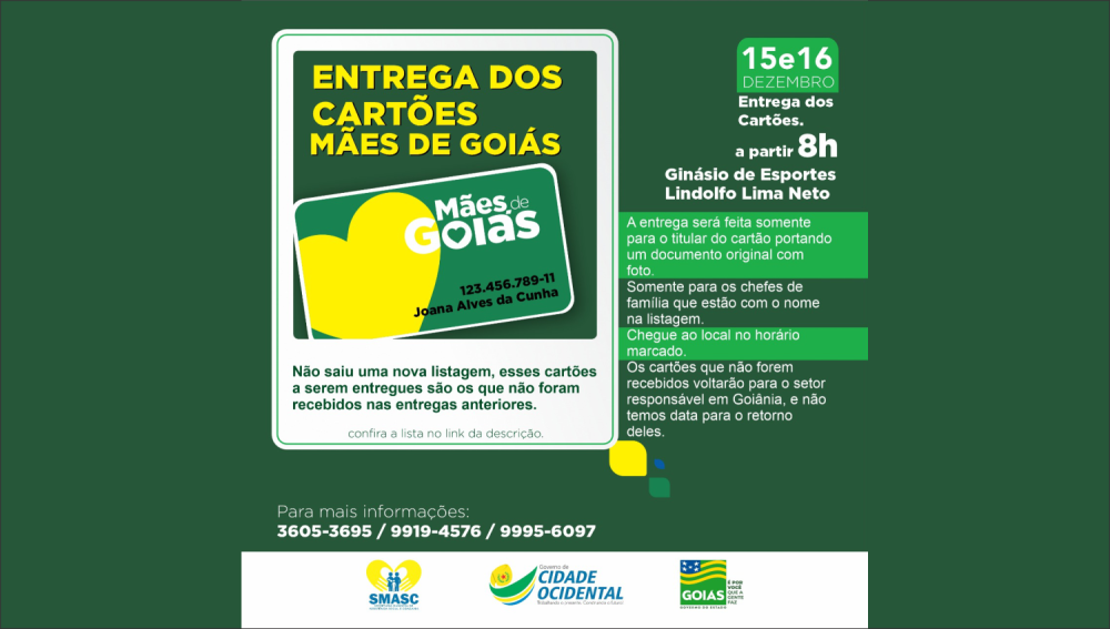 A Secretaria Municipal de Assistência Social de Cidade Ocidental, informa que a entrega dos cartões mães de Goiás será realizada nos dias (15/12) e (16/12), no ginásio de esportes do centro da cidade juntamente com o Mutirão do emprego, a partir de 8h da manhã.