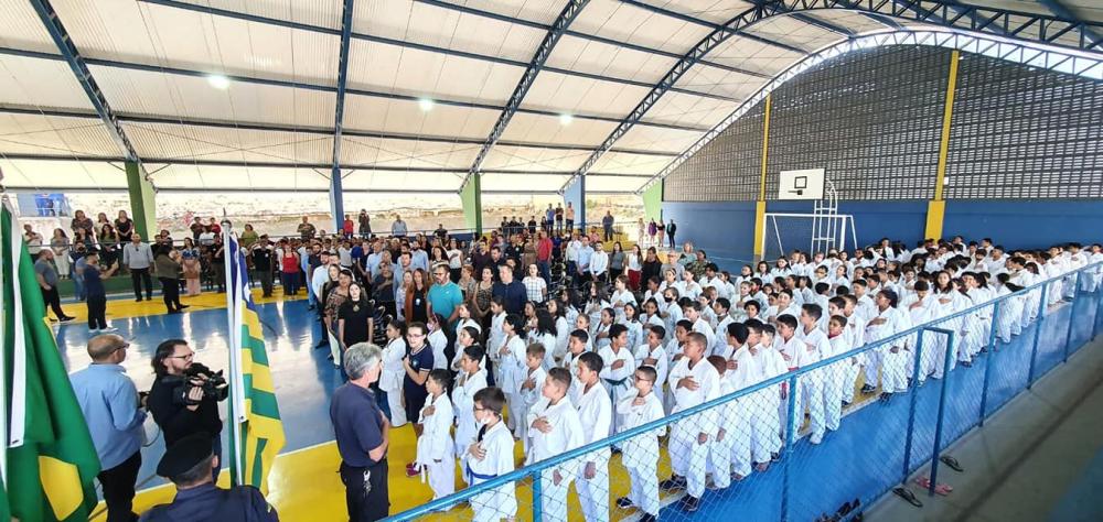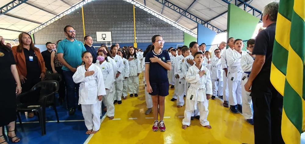 Começamos a semana com o nosso tradicional Momento Cívico, realizado na manhã desta segunda-feira (29), na Escola Municipal Josefa Maria de Lima. Por intermédio do secretário de educação, Anderson Luciano, fizemos a entrega simbólica de 200 kits de quimonos aos alunos da nossa rede de ensino que praticam do projeto de karatê com o professor Elizaldo. Em seguida os alunos do projeto dos Guardiões da Terra, idealizado pelo diretor Josiel Barbosa, fizeram uma belíssima apresentação de Ordem Unida. O evento contou, ainda, com a presença do Prefeito, Fábio Correa acompanhado de sua esposa Marli Lessa, do vice-prefeito Lula Viana, do presidente da Câmara representando dos vereadores, Erasmo Carlos, do Prefeito de Valparaíso, Pábio Mossoró, e da equipe de secretários e servidores. Recebemos a visita institucional do meu amigo e deputado federal Adriano do Baldy, e da minha amiga Zeli Fritsche, vice-prefeita de Valparaíso de Goiás.