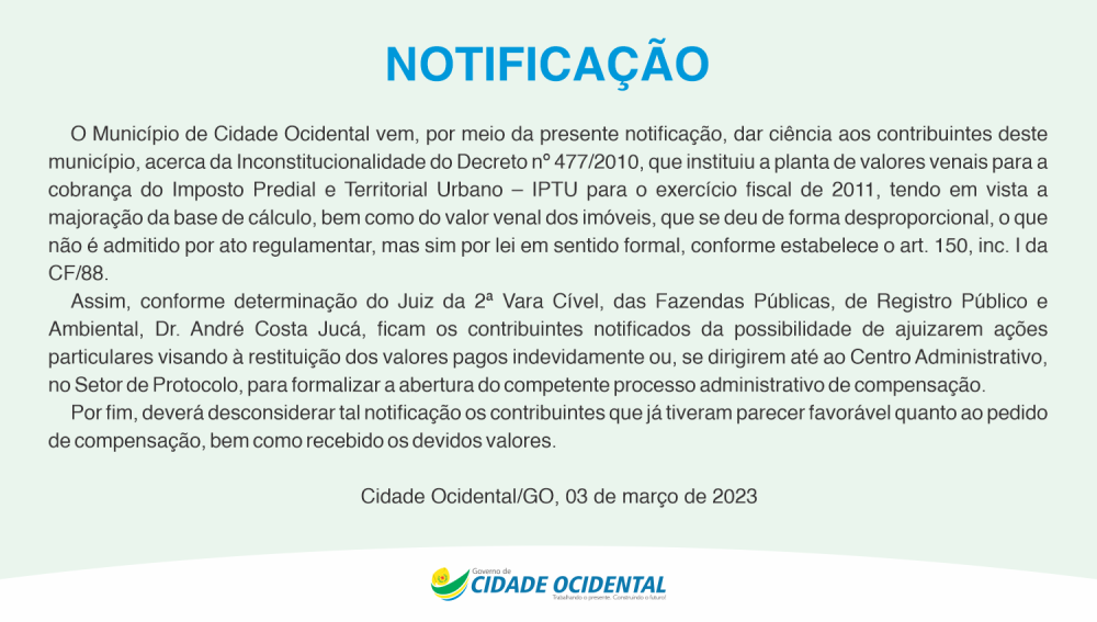 O Município de Cidade Ocidental vem, por meio da presente notificação, dar ciência aos contribuintes deste município, acerca da Inconstitucionalidade do Decreto nº 477/2010, que instituiu a planta de valores venais para a cobrança do Imposto Predial e Territorial Urbano – IPTU para o exercício fiscal de 2011, tendo em vista a majoração da base de cálculo, bem como do valor venal dos imóveis, que se deu de forma desproporcional, o que não é admitido por ato regulamentar, mas sim por lei em sentido formal, conforme estabelece o art. 150, inc. I da CF/88.