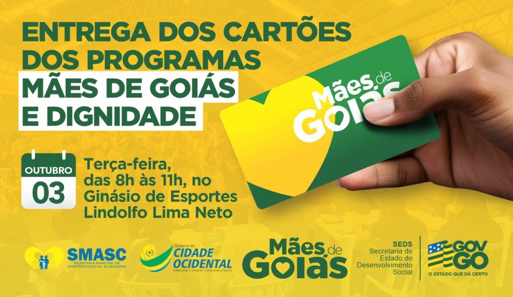 A Prefeitura de Cidade Ocidental, através do Governo do Estado de Goiás e do Governo Federal, realizará no próximo dia 03 de outubro (das 08h às 11h) a entrega dos cartões para os novos beneficiados dos programas sociais Mães de Goiás e Dignidade. Será realizada uma cerimônia no Ginásio Lindolfo Lima Neto, com a presença do governador, Ronaldo Caiado e da primeira-dama, Gracinha Caiado, acompanhados do prefeito, Fábio Correa e da primeira-dama da cidade, Drª Marli Lessa.