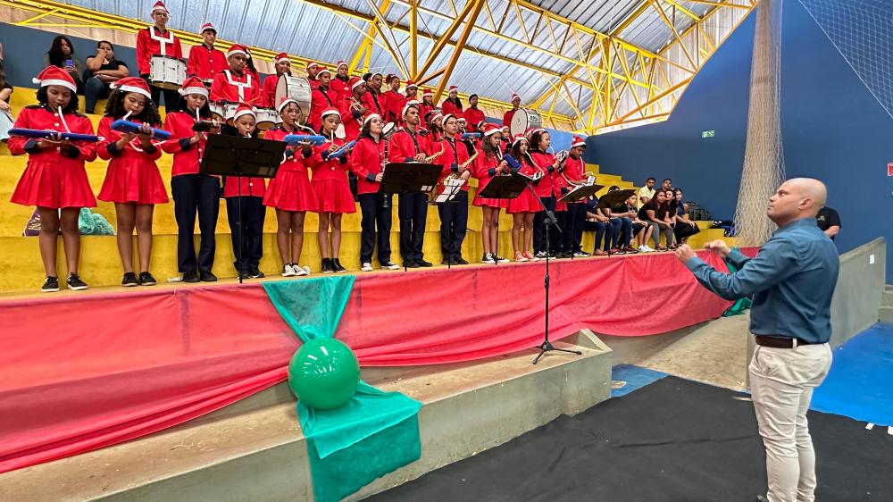 No último Momento Cívico desse ano, a Prefeitura reuniu crianças das escolas municipais para a Cantata de Natal numa linda despedida do ano letivo de 2023. A banda da escola Maria Pereira Braga fez uma belíssima apresentação da música Noite Feliz. E as crianças das escolas Beatriz Pereira, Frei Amilton e CMEI Bendito Antônio cantaram lindamente a canção Vem que está chegando o Natal e emocionaram a todos na abertura da cerimônia.