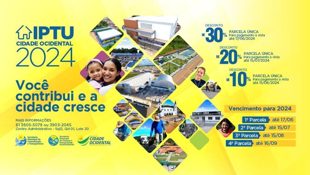 A Prefeitura de Cidade Ocidental, por meio da Secretaria Municipal de Finanças, está oferecendo descontos de até 30% aos contribuintes que optarem pelo pagamento em cota única do Imposto Predial e Territorial Urbano (IPTU) de 2024. Confira as opções para aproveitar os descontos:
