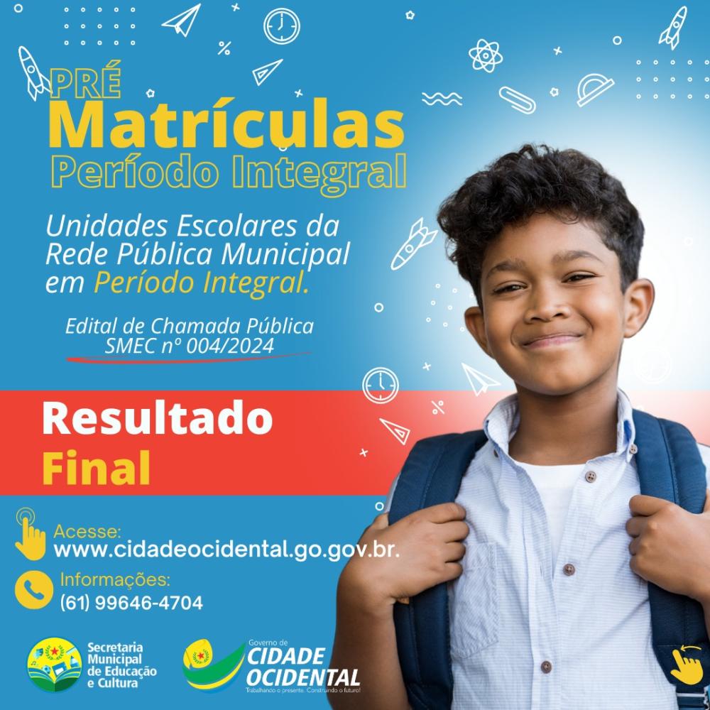 A Prefeitura Municipal de Cidade Ocidental-GO, por meio da Secretaria Municipal de Educação e Cultura - SMEC, nos termos do art.205 da Constituição Federal de 1988, do art.5º, II da Lei Federal nº 9.394/96 e da Lei Federal nº 14.640/2023 e Resolução do Conselho Municipal de Educação-CME nº 025/2024 e 026/2024, divulga a Chamada Pública para inscrições, visando concorrer a vagas para o Período INTEGRAL em unidades escolares da REDE PÚBLICA MUNICIPAL DE ENSINO, nos termos definidos neste instrumento.