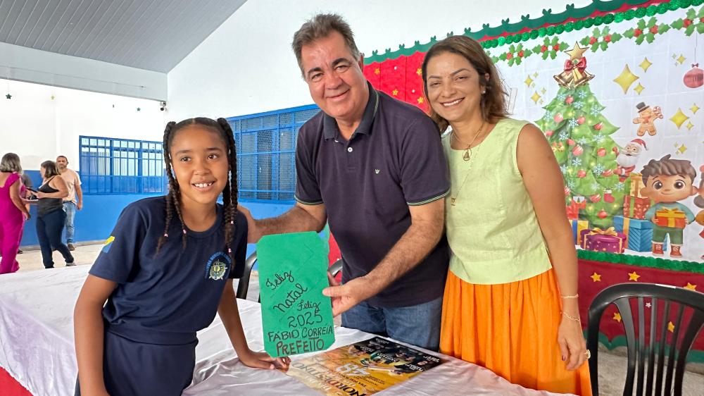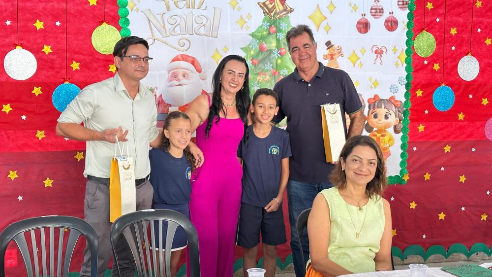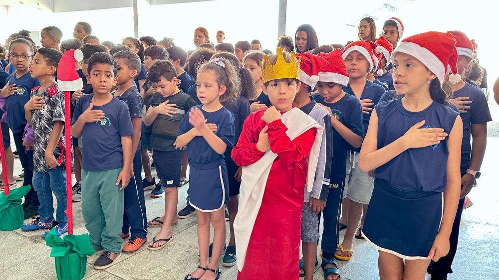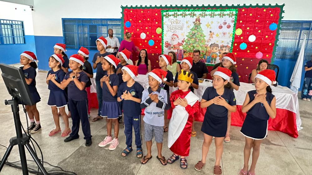 Durante o evento, uma turma da educação infantil realizou uma apresentação especial, cantando uma canção natalina que encantou os presentes e trouxe um clima de confraternização.