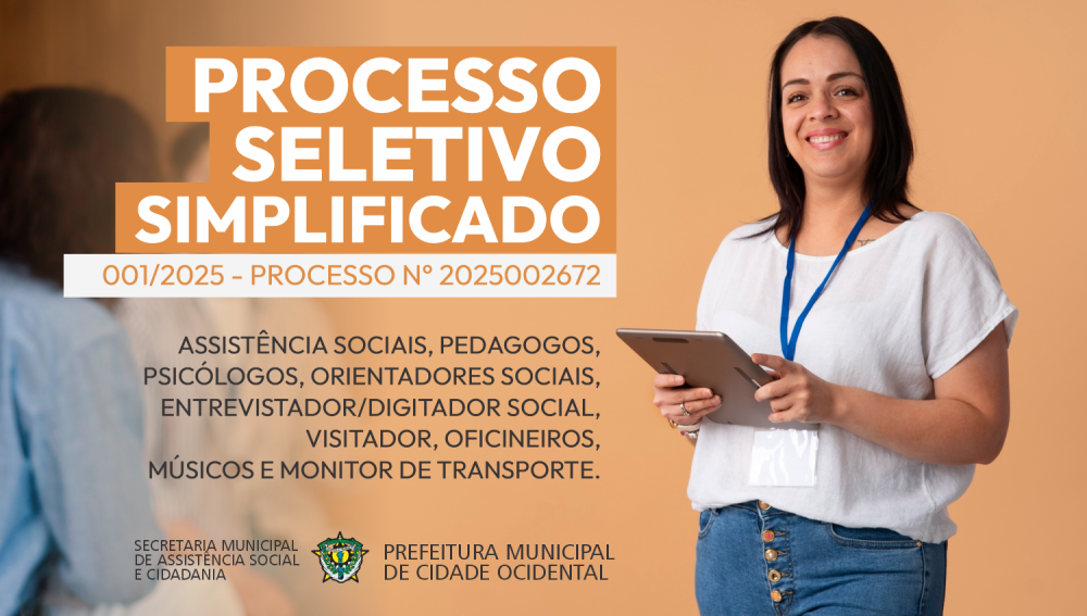O MUNICÍPIO DE CIDADE OCIDENTAL-GO, pessoa jurídica de direito público, com sede na SQ 10 QD 08 Lote 45 “A”, Área Especial, centro, Cidade Ocidental-GO, inscrito no CNPJ n° 36862621/0001-21, através da Secretaria Municipal de Assistência Social e Cidadania, por meio da Comissão Especial de Avaliação e Acompanhamento do Processo Seletivo Simplificado, designada pela portaria 004/2025 e pela Resolução nº 005, de 25 de fevereiro de 2025 do Conselho Municipal de Assistência Social e processo administrativo nº 2025002672, nos termos do art. 37, inciso IX da Constituição Federal e Lei Municipal nº 902, de 25 de abril de 2013 e suas alterações posteriores e Lei Municipal nº 1.460 de 17 de setembro de 2024, que prevê, no Título VII, a contratação temporária e emergencial para atendimento de programas de Assistência Social, conforme o artigo 169 e seguintes, torna público a abertura das inscrições ao PROCESSO SELETIVO SIMPLIFICADO 001/2025, qual será realizado por análise de currículos, prova de títulos e experiência profissional, conforme descrito neste edital e seus Anexos, com a finalidade de selecionar profissionais para o exercício temporário dos cargos para Assistentes Sociais, Pedagogos, Psicólogos, Orientadores Sociais, Entrevistadores Sociais/digitadores, Visitador, Oficineiros de artesanato, Oficineiros de dança, Oficineiros de Esporte, Oficineiros de Música, Oficineiros de teatro, Músico e Monitor de transporte, objetivando o funcionamento adequado das unidades, programas e projetos sociais desenvolvidos por esta secretaria, conforme cartilha de indicações do Sistema Único de Assistência Social- SUAS.