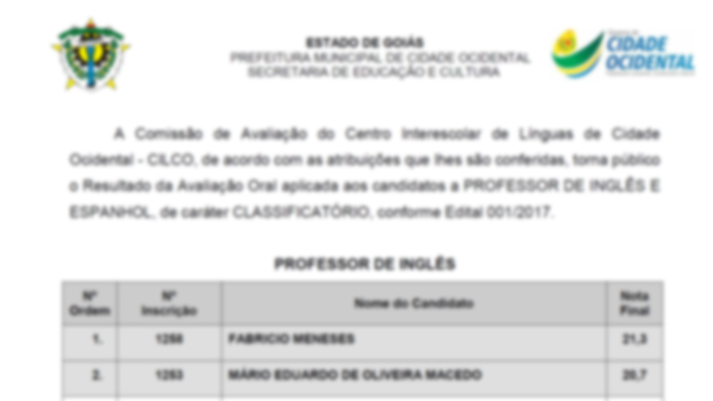 A Comissão de Avaliação do Centro Interescolar de Línguas de Cidade Ocidental - CILCO, de acordo com as atribuições que lhes são conferidas, torna público o Resultado da Avaliação Oral aplicada aos candidatos a PROFESSOR DE INGLÊS E ESPANHOL, de caráter CLASSIFICATÓRIO, conforme Edital 001/2017. Baixe o arquivo