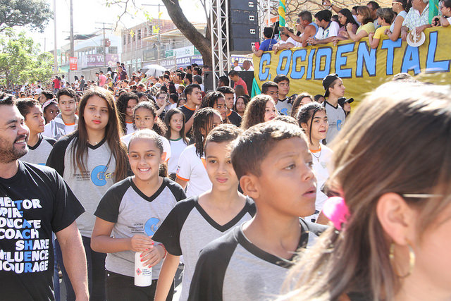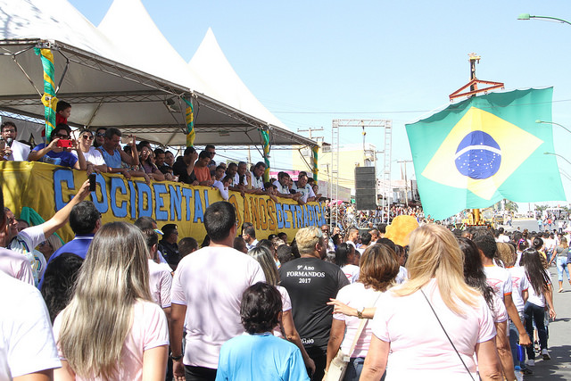 Desfile Cívico de Cidade Ocidental, tido como o maior do Entorno de Brasília, atraiu na última quinta (7), mais de 10 mil pessoas ANDRE BRITO Os moradores de Cidade Ocidental acordaram cedo para participar das comemorações ao dia da Independência do Brasil, evento tradicional que leva as instituições públicas e privadas às ruas, todos os anos. Organizado pela Secretaria de Educação, Cultura, Esporte e Lazer, diversas agremiações, entre escolas municipais, estaduais, bandas marciais e bandas militares, participaram do primeiro desfile cívico sob o comando da nova gestão municipal representada pelo prefeito Fábio Correa e assistido por todos os secretários municipais, comandante do Policiamento de Cidade Ocidental Major Crisóstomo, vereadores e líderes comunitários. A abertura ficou por conta da banda da Polícia Militar de Goiás, seguida dos militares do Comando de Operações de Divisa e Batalhão de Choque, todos da PMGO, que foram seguidos na avenida pela Guarda Civil Municipal em seu primeiro desfile cívico. A guarda mirim, organizada pelo Instituto Anjos de Rua, também participou da festividade cívica, com seus membros, cuja missão é dar uma alternativa aos jovens para que estes não seguiam os caminhos errados da vida. A Comitiva 100 Futuro, do Povoado Mesquita, encerrou o desfile representado as já tradicionais cavalgadas de Cidade Ocidental, com seus portentosos cavalos. ORGANIZAÇÃO A participação das escolas foi determinante para o sucesso do tradicional evento, que foram divididas em cinco concentrações, com mais de 2000 alunos, ao longo da Superquadra 16. As escolas tinham as principais bandas marciais da cidade como puxadores: banda marcial do Colégio Estadual Jorge Amado, banda marcial da Escola Municipal Paulo Freire e banda do Colégio Estadual Ocidental, além das bandas das escolas particulares. Por toda a avenida, foram postados bebedouros com água para amenizar os efeitos da seca. Todos os estudantes, antes de ir para a avenida, fizeram um lanche reforçado proporcionado pelas escolas. O desfile desse ano trouxe de volta os valores eminentemente cívicos, com tema único: os símbolos pátrios. Entusiasmado, o Prefeito Fábio Correa, firmou compromisso de manter o desfile pelos próximos anos, mas melhorando cada vez mais. “Ano que vem, vamos começar a pensar na Semana da Pátria, encerrando com o desfile na orla do Lago Jacob e aproveito para agradecer a todos os diretores, funcionários e estudantes da Secretaria de Educação pelo empenho em organizar um evento tão simbólico e importante para os ocidentalenses.”
