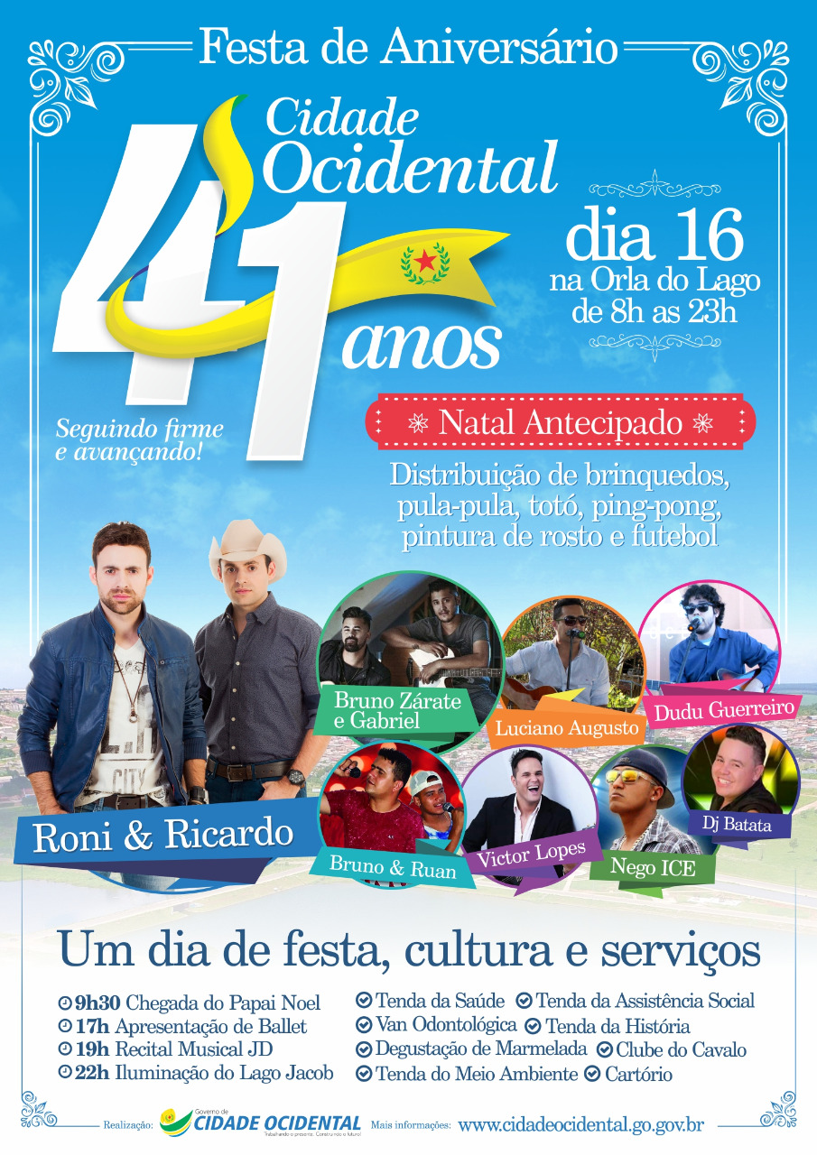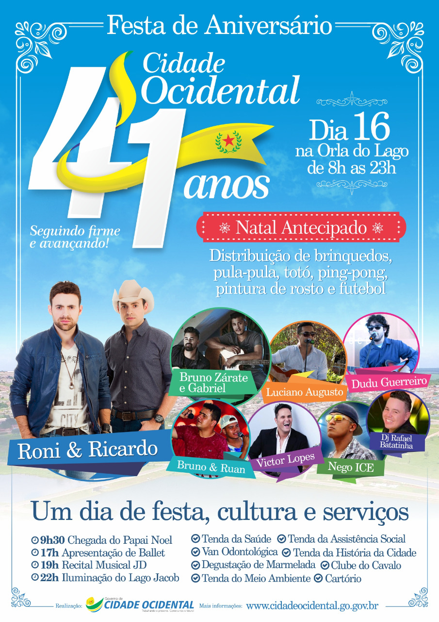 A orla do Lago Jacob é o palco da festa que acontece no dia 16, a partir das 08:00 horas, com o "Natal Antecipado" e distribuição de brinquedos para as crianças. Ao longo de todo o dia as Secretarias Municipais, juntamente com parceiros da Prefeitura Municipal, ofertarão serviços básicos. Enquanto isso, no palco principal, os artistas locais provam que Cidade Ocidental é um celeiro de talentos. CONFIRA A NOSSA PROGRAMAÇÃO: