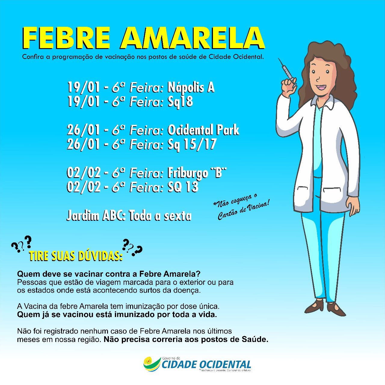 ANDRÉ BRITO Iniciada na última sexta-feira (19), a vacinação contra a febre amarela em Cidade Ocidental será feita em diversos bairros na cidade. Segundo a Secretaria de Saúde, nenhum caso foi registrado na região, por isso, não há motivo para preocupação. Mesmo assim, o Secretário de Saúde, Mauro Neiva garante que haverá vacinas suficientes para atender a demanda. "Se você já foi imunizado, não precisa tomar novamente a vacina, pois uma dose vale para a vida toda. Caso contrário, ao se dirigir ao posto, não esqueça de levar seu cartão de vacina," lembra o Secretário. A vacinação contra a febre amarela, que será feita todas as sextas-feiras, ocorrerá nos bairros Parque Nápolis, Jardim ABC, Ocidental Park e nos postos das Superquadras 13, 15 e 17. TRANSMISSÃO A febre amarela é transmitida por animais ou insetos (mosquito aedes-aegypty) a pessoas não vacinadas em áreas de mata. A vacinação está disponível nos postos de saúde de todo o país e é recomendada para pessoas que habitam ou visitam áreas com risco da doença. Uma dose apenas garante imunidade por toda a vida. Segundo o Ministério da Saúde, são menos de 15 mil casos por ano no Brasil. A doença pode ser evitada com vacina. O tratamento pode ajudar, mas a doença não tem cura. Requer um diagnóstico médico por meio de exames laboratoriais ou de imagem. No curto prazo, resolve-se em dias ou semanas. Se você já foi imunizado, não precisa correria. Caso contrário, não esqueça de levar seu cartão de vacina. SINTOMAS Os casos leves causam febre, dor de cabeça, náuseas e vômitos. Os casos graves podem causar doenças cardíacas, hepáticas e renais fatais. As pessoas podem ter: