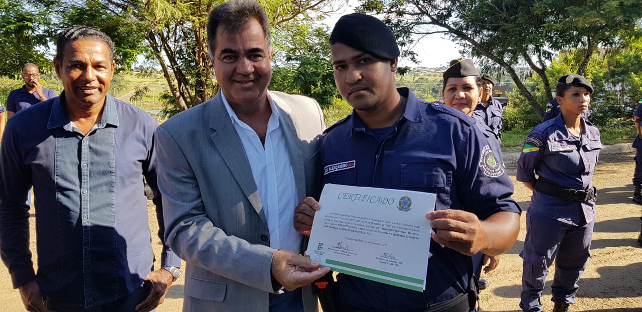 Durante o Momento Cívico desta manhã de segunda-feira (23), foram entregues os certificados do Curso de Formação a 09 Guardas Civis Municipais, que participaram do treinamento no município de Valparaíso, além da certificação de 15 GCMs pela conclusão do curso de uso de Dispositivos Eletrônicos de Controle (DEC). A solenidade contou com a participação do colaborador do Ministério da Justiça, Hernany Bueno, do coordenador de Prevenção à Violência do Ministério da Segurança Pública, Gustavo Rocha, vice-prefeito Lulinha, vereadores Kedma Karen (PT), Marcelo Buiu (SD) e Eliezer Batista (PEN), que juntamente com o prefeito Fábio Correa, repassaram aos concluintes dos cursos, os respectivos certificados.