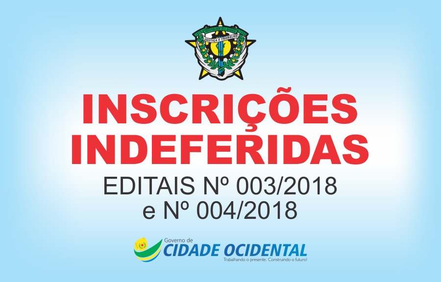 A Prefeitura Municipal, por intermédio da Secretaria Municipal de Educação, torna pública as inscrições indeferidas do processo seletivo simplificado dos editais n° 003/2018 e n° 004/2018. Para conferir na íntegra acesse o link: Inscrições Indeferidas