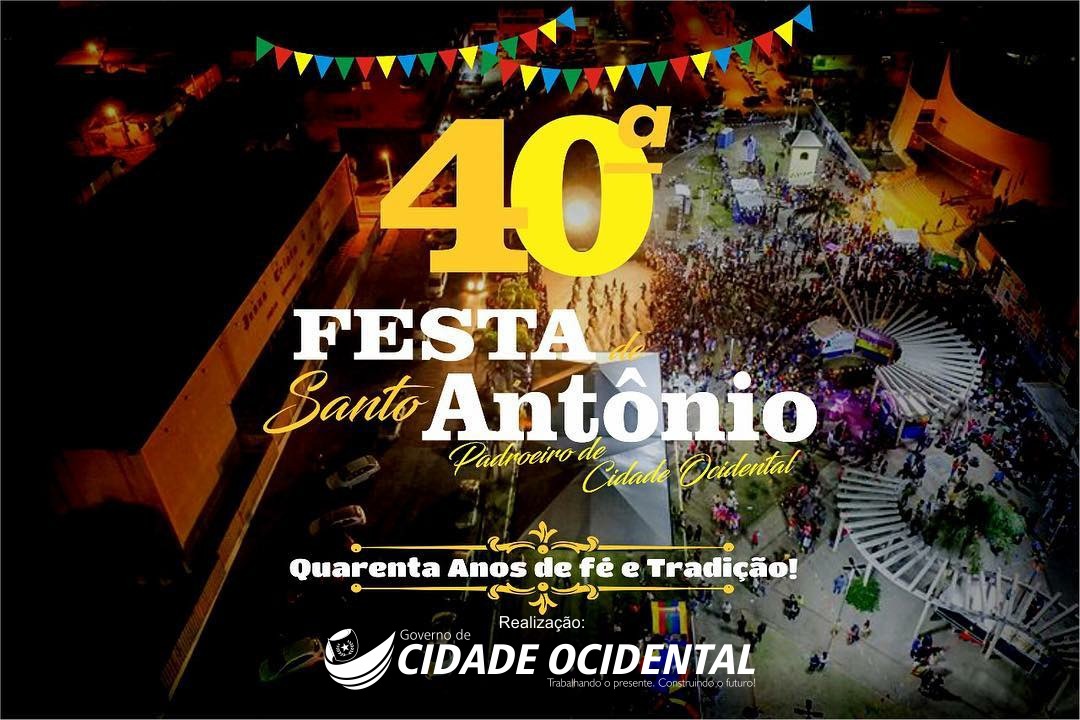 As festividades juninas tradicionalmente fazem parte da cultura e da fé dos católicos em todo o Brasil. Em Cidade Ocidental, a Festa do Padroeiro Santo Antônio se tornou uma das festividades mais tradicionais e aguardadas do calendário municipal. Realizada desde 1978 com a colaboração voluntária dos fiéis da paróquia e comunidades vizinhas, que ano após ano, se dedicam para receber com muito carinho as mais de 20 mil pessoas que chegam a passar a cada fim de semana da festa. Em sua programação, além das orações, barraquinhas com comidas típicas, shows e apresentações de quadrilha, a festa conta ainda com o Bingão de Santo Antônio e o Almoço dos Fazendeiros. A Solenidade de Santo Antônio é comemorada no dia 13 de junho, e durante os treze dias que antecedem a data, é celebrada também a Trezena de Santo Antônio, onde os devotos participam das missas e das orações em busca de alcançarem uma graça, pedindo com fé a intercessão deste que é considerado um dos santos com mais milagres realizados. Neste ano de 2018, a Festa de Santo Antônio que é Padroeiro de Cidade Ocidental, comemora seus 40 anos, trazendo alegria e diversão para as famílias ocidentalenses e de regiões vizinhas, se consolidando uma das mais importantes manifestações de fé é cultura do nosso povo. Confira a programação completa dessa festa: Quarta - feira 30/05: 1º Dia – Trezena, 19:00h Santo Antônio – De sua vida e prodigalidade. Benção do Dia: Poder Executivo. Quinta - feira 31/05: Corpus Cristi: Procissão saindo da igreja Matriz para Capela Nossa Senhora de Fátima 8:00h. Sexta - feira 01/06: 2º Dia – Trezena, 19:00h Santo Antônio – Sua vocação religiosa. Benção do Dia: Comerciantes. 21:00 Festa Social: barraquinhas. Show: Oxente Cerrado. Participação especial: Pedro Lima Sábado 02/06: 3º Dia – Trezena, 19:00h Santo Antônio – Transferência para a Ordem Franciscana. Benção do Dia: Profissionais de Segurança Pública. 21:00 Festa Social: barraquinhas. Show: Ronny & Roberta. Participação especial: Bruna Li e Fernandes Domingo 03/06: 4º Dia – Trezena, 19:00h Santo Antônio – O Encontro de Santo Antônio com São Francisco de Assis. Benção do Dia: Pequenos Agricultores. 21:00 Festa Social: barraquinhas. Show: Roni & Ricardo. Participação especial: Michel Couto Segunda - feira 04/06: 5º Dia - Trezena- Santo Antônio – Guiado pela mão da Divina Providência. Benção do Dia: Profissionais de Saúde. Terça - feira 05/06: 6º Dia - Trezena Santo Antônio – Início de sua vida apostólica como grande Pregador. Benção do Dia: Vocações Sacerdotais e Religiosas. Quarta - feira 06/06 7º Dia - Trezena Santo Antônio – Força irresistível de suas palavras. Benção do Dia: Profissionais de Educação. Quinta - feira 07/06 8º Dia - Santo Antônio – De seus Milagres. Benção do Dia: Feirantes. Sexta - feira 08/06 9º Dia – Trezena, 19:00h. Santo Antônio – De sua pregação aos peixes para confundir os indiferentes. Benção do Dia: Advogados e Poder Judiciário.21:00 Festa Social: barraquinhas. Show: Encosta Neu e Neto e Rodrigo. Sábado 09/06: 10º Dia – Trezena, 19:00h. Santo Antônio – O testemunho na presença real de Jesus na Santíssima Eucaristia. Benção do Dia: Profissionais de limpeza e conservação da cidade. 21:00 Festa Social: barraquinhas. Show: Naldo José - Forró in Deus. Domingo 10/06: 11º Dia – Trezena, 19:00h Santo Antônio – De seu encontro com o Menino Jesus. Benção do Dia: Mulheres. 14:00h Festa Social: barraquinhas. BINGÃO de Santo Antônio. Segunda - feira 11/06: 12º Dia – Trezena, 19:00h Santo Antônio – Da morte de Santo Antônio. Benção do Dia: Poder Legislativo (Vereadores). 21:00 Festa Social: barraquinhas. Show: Jhonny & Rahony Terça - feira 12/06: 13º Dia – Trezena 19:00h: Santo Antônio – De sua canonização. Benção do Dia: Trabalhadores domésticos. 21:00 Festa Social: barraquinhas. Show: Roni & Ricardo. Quarta - feira 13/06: 14° dia - Solenidade de Santo Antônio. Show: Ministério Eloí.