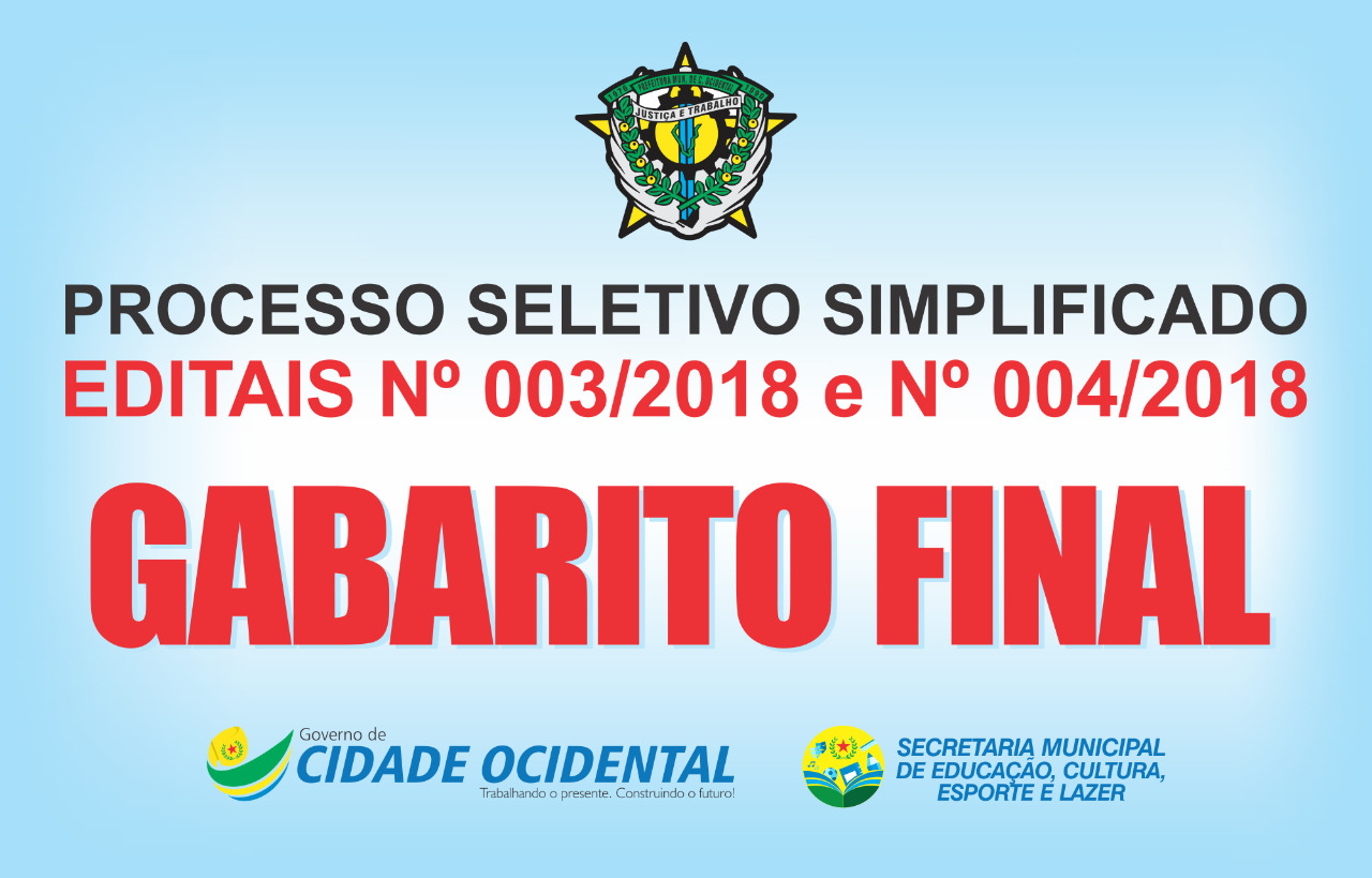 A Prefeitura Municipal, por intermédio da Secretaria Municipal de Educação, torna pública os Gabaritos finais do processo seletivo simplificado dos editais n° 003/2018 e n° 004/2018. Para conferir na íntegra acesse o link: Gabarito Final Edital n° 003/2018 Gabarito Final Edital n° 004/2018
