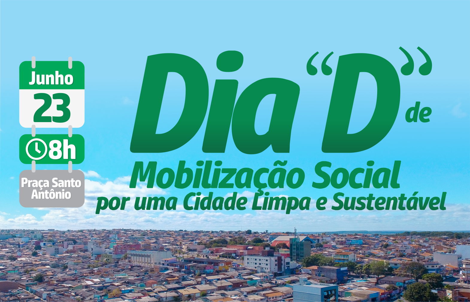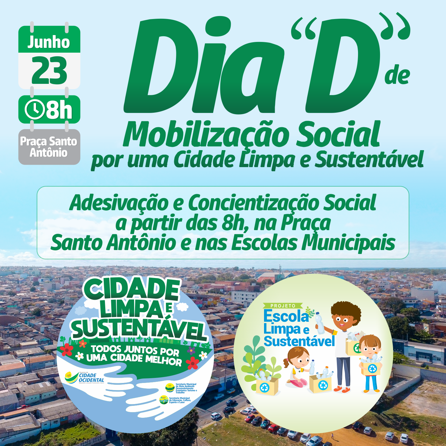 Felipe Chiavegatto Lançado este mês, o programa Cidade Limpa e Sustentável é um projeto de iniciativa do Governo Municipal que visa conscientizar toda a população sobre a responsabilidade por um município que tenha a sustentabilidade como objetivo primordial para o desenvolvimento. Neste sábado, mais uma etapa do programa será cumprida com o Dia D de Mobilização Social. Serão feitas blitzes educativas com adesivação de veículos e palestras sobre conscientização social. “O que queremos é mostrar o papel do cidadão em relação à imagem do seu município fazer com que ele participe, junto com o Governo, de uma cidade limpa e sustentável”, explica o prefeito Fábio Correa. O evento prevê que sejam feitas as mesmas ações em todas as escolas municipais como mais um braço do programa, o projeto Escola Limpa e Sustentável. Este já vem sendo desenvolvido junto aos alunos da rede municipal de ensino incentivando os alunos a aprender e ensinar os conceitos de sustentabilidade, inclusive com premiação dos melhores projetos na área, desenvolvidos pelos próprios alunos. A escolha dos vencedores deve ser feita durante a 2ª edição da Mostra Ambiental de Cidade Ocidental, no dia 25 O Dia D acontece na Praça Santo Antônio a partir das 8 horas da manhã deste sábado, dia 23 de junho.