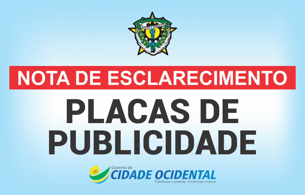 A PREFEITURA MUNICIPAL DE CIDADE OCIDENTAL vem a público esclarecer a respeito dos procedimentos adotados na OPERAÇÃO PLACA DE PUBLICIDADE, que vem sendo executada pela FISCALIZAÇÃO DE POSTURAS. Há um INQUÉRITO CIVIL instaurado pelo MINISTÉRIO PÚBLICO DO ESTADO DE GOIÁS, datado de 2016, que está em trâmite na 4ª PROMOTORIA DE JUSTIÇA DE CIDADE OCIDENTAL, que requisita informações a respeito do regramento municipal referente a alocação de placas de publicidade.