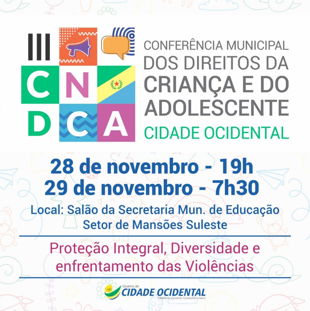 O Conselho Municipal da Criança e do Adolescente, com apoio do Governo de Cidade Ocidental, promoverá nos dias 28 e 29 de novembro, a Conferência Municipal dos Direitos da Criança e do Adolescente, com o tema: “Proteção Integral, Diversidade e Enfrentamento das Violências.