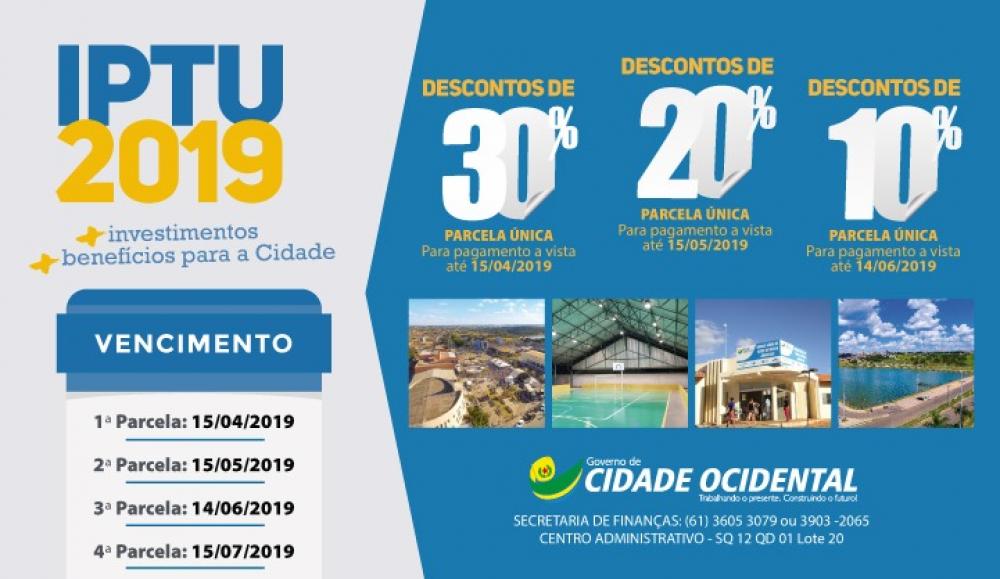 A distribuição dos carnês do Imposto Predial e Territorial Urbano (IPTU) segue pelos bairros de Cidade Ocidental. Serão entregues 40.621 mil boletos por todo o município. O prazo de vencimento da cota única e da primeira parcela do IPTU 2019 se encerra no dia 15 de abril.