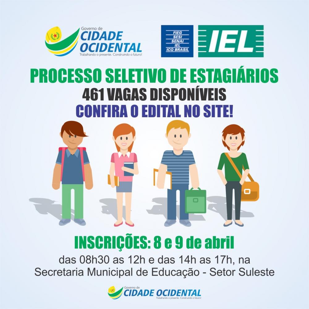 A Prefeitura Municipal de Cidade Ocidental por intermedio do IEL- INSTITUTO EUVALDO LODI, torna pública a realização do processo seletivo para o preenchimento de vagas e formaçao de cadastro reserva para estagio remunerado.