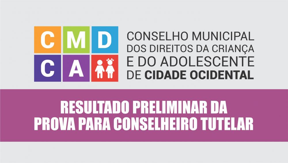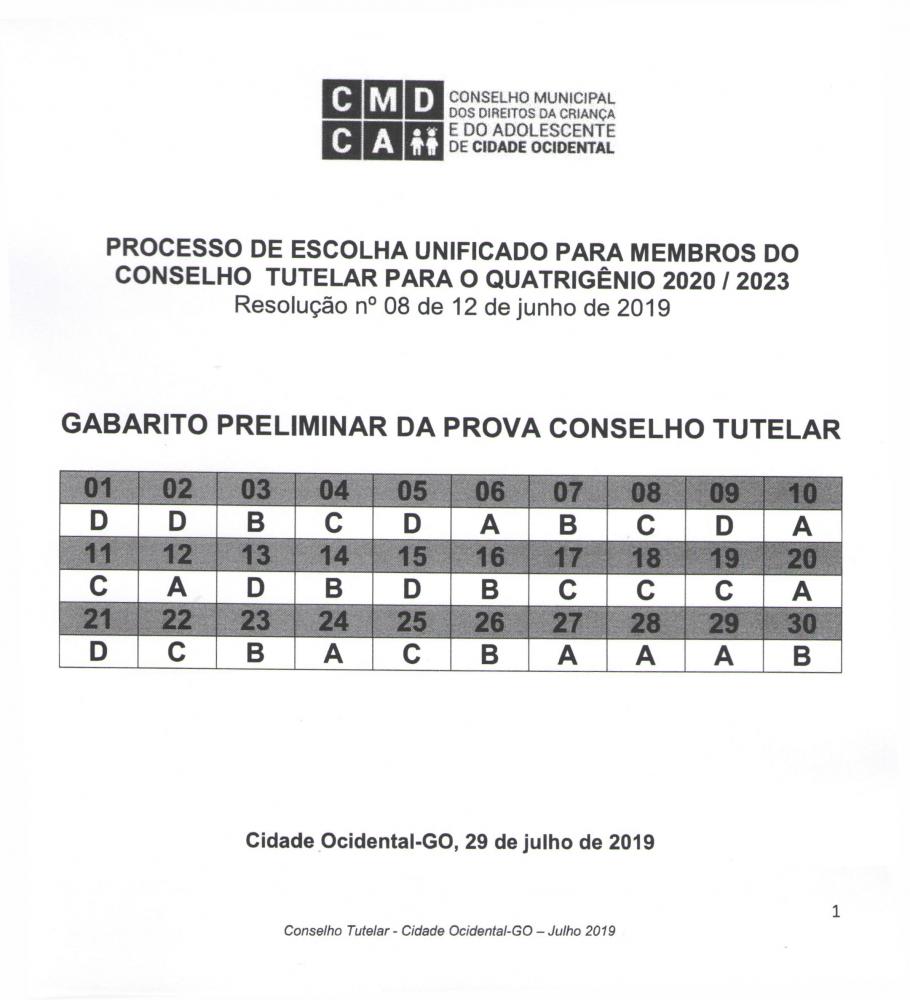 A Comissão Especial Eleitoral do Processo de escolha dos Conselheiros Tutelares do ano de 2019 do Município de Cidade Ocidental/GO, no uso de suas atribuições legais, conforme preconiza a Lei Federal n° 8.069/90-Estatuto da Criança e do Adolescente, as Resoluções n° 152/2012 e 170/2014, ambas expedidas pelo Conselho N acional dos Direitos da Criança e do Adolescente - CONANDA e as Leis Municipais n° 710/2008, 1183/2019, TORNA PÚBLICO, DIVULGA e HOMOLOGA a prova, o gabarito e o Resultado Preliminar do Processo Eletivo para Conselheiro Tutelar sob o Edital 002/2019 de 17 de julho de 2019, conforme link abaixo: