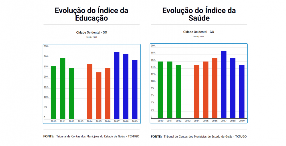 Outra área que se destacou, segundo o TCM, foi a saúde. O Governo atual de Cidade Ocidental chegou a destinar 19,82% da arrecadação para o setor. O índice histórico também supera o mínimo constitucional, que no caso da saúde é de 15%.