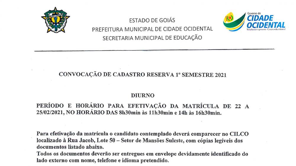 CONVOCAÇÃO DE CADASTRO RESERVA 1ª SEMESTRE 2021
