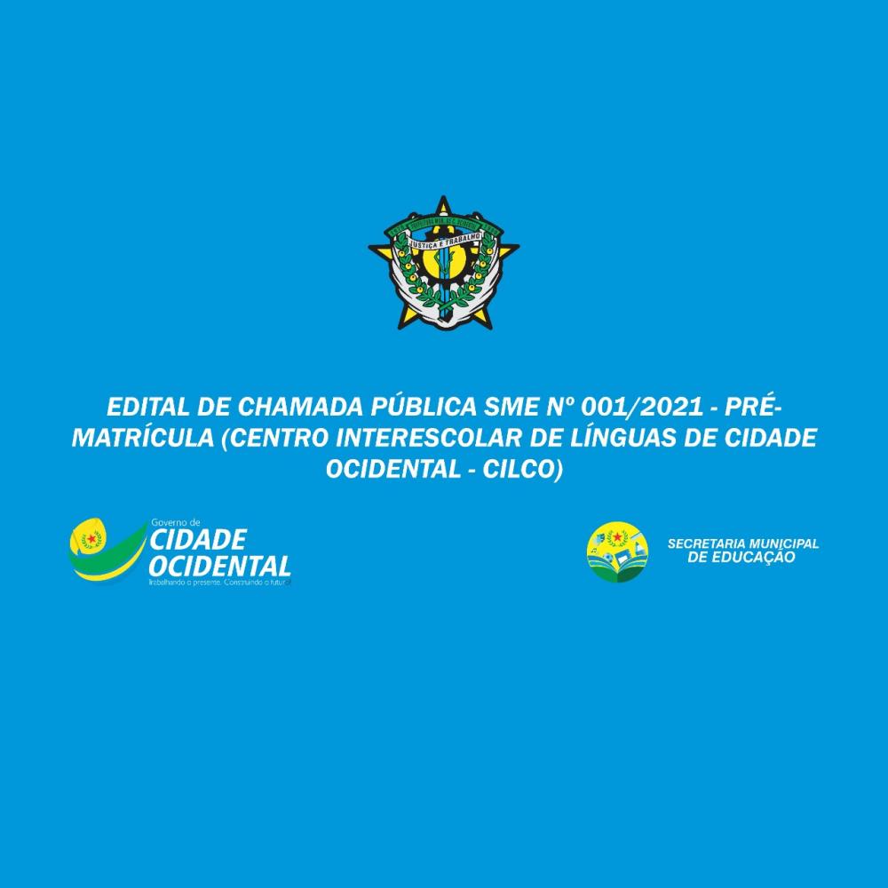 A Prefeitura Municipal de Cidade Ocidental – GO, por meio da Secretaria Municipal de Educação, torna público o processo de pré-matrículas, visando o preenchimento de vagas para os cursos de Língua Estrangeira Moderna (Inglês e Espanhol) e Língua Brasileira de Sinais – LIBRAS do Centro Interescolar de Línguas de Cidade Ocidental – CILCO, para o 2° semestre letivo de 2021.