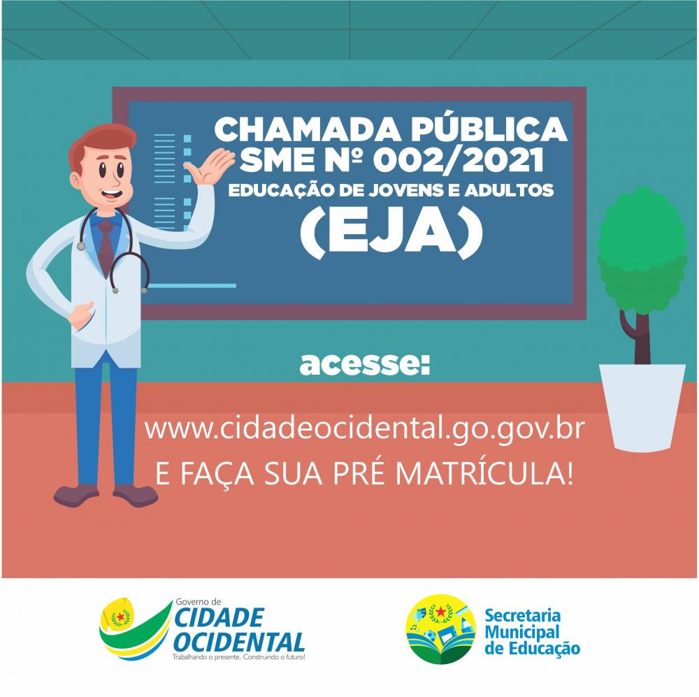 A Prefeitura Municipal de Cidade Ocidental – GO, por meio da Secretaria Municipal de Educação, nos termos do art. 205 da Constituição Federal de 1998, do art. 5º §1º, II da Lei Federal n° 9.394/96 e da Resolução CME n° 002/2012, divulga a Chamada Pública para pré-matrículas, visando o preenchimento de vagas nas unidades escolares da REDE PÚBLICA MUNICIPAL DE ENSINO, como forma de atender a demanda da Educação de Jovens e Adultos – Ensino Fundamental.
