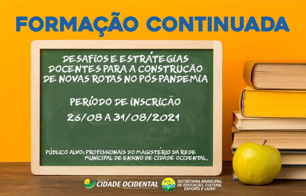 A Escola de Formação do Município está com inscrições abertas para professores, diretores, coordenadores e supervisores da rede municipal de ensino que queiram participar do 2⁰ Curso de Formação Continuada, autorizado pelo Conselho Municipal de Educação (CME), cujo tema é: Educação, Transformação e Desafios Estratégicos dos Docentes para a construção de novas rotas no pós-pandemia.