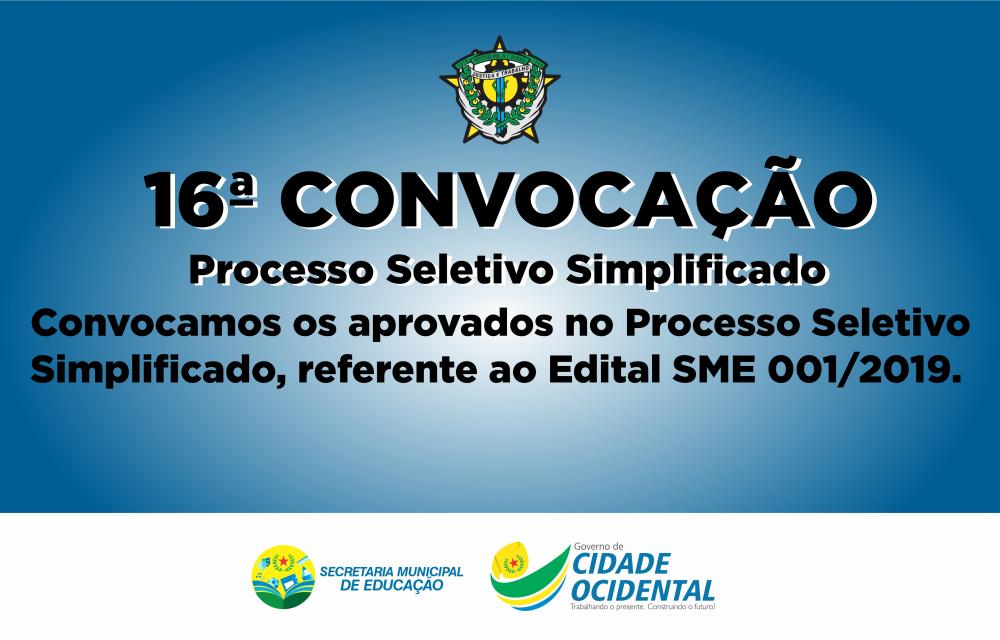 16ª CONVOCAÇÃO PROCESSO SELETIVO SME 001/2019