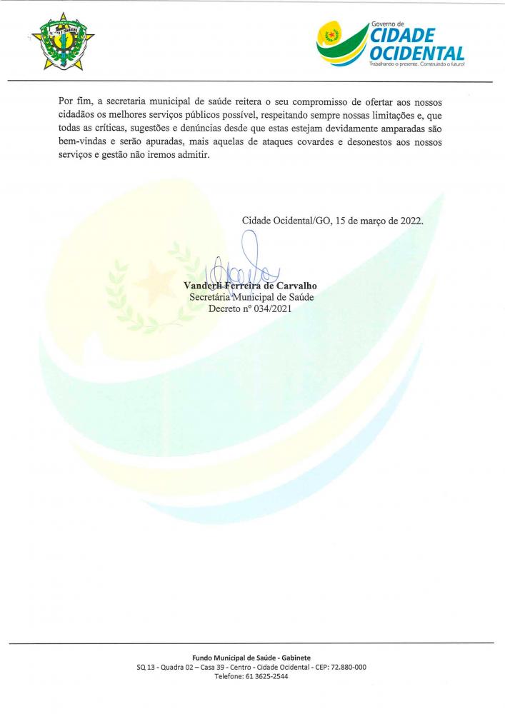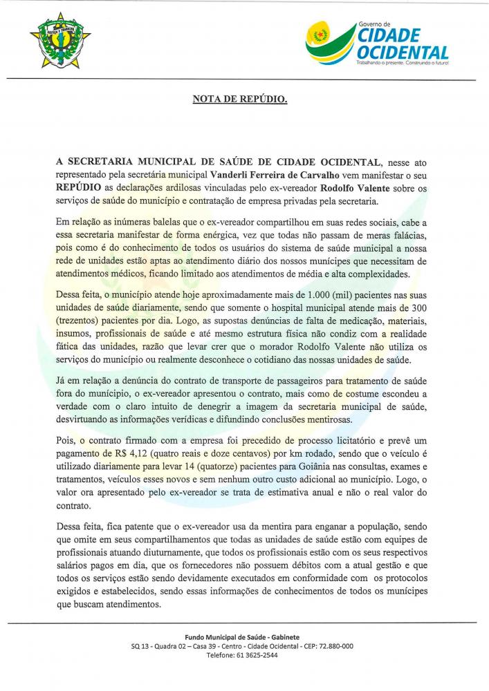A SECRETARIA MUNICIPAL DE SAÚDE DE CIDADE OCIDENTAL, nesse ato representada pela secretária municipal de Saúde, Vanderli Ferreira de Carvalho vem manifestar o seu REPÚDIO as declarações ardilosas vinculadas pelo ex-vereador Rodolfo Valente sobre os serviços de saúde do município e contratação de empresa privadas pela secretaria.