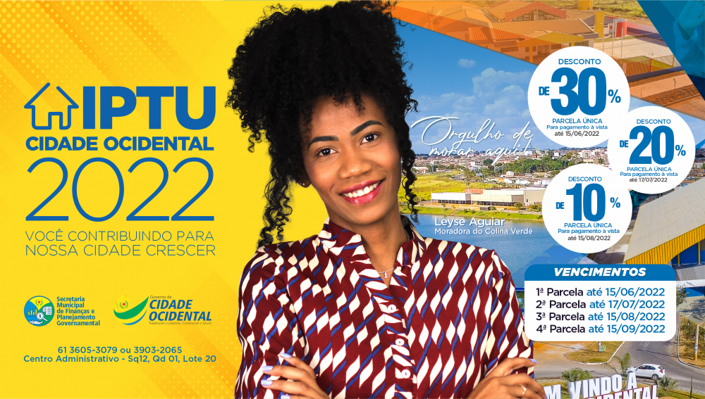 A Prefeitura Municipal de Cidade Ocidental, juntamente com a Secretaria Municipal de Finanças, está disponibilizando os carnês do IPTU 2022. A população terá 30% de desconto até o dia 15 de junho, na data de vencimento da parcela única para pagamento à vista.